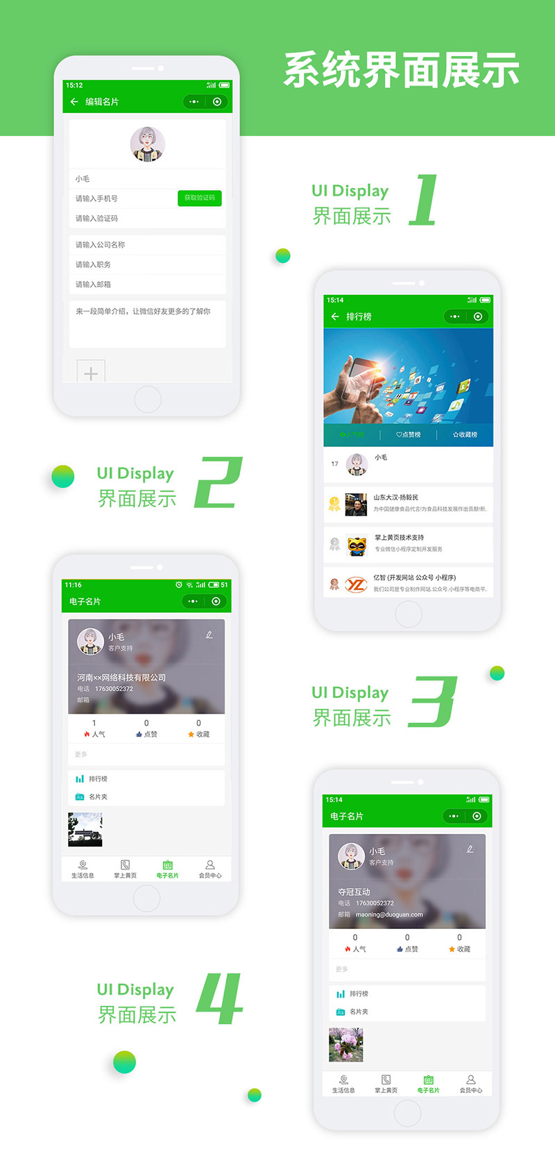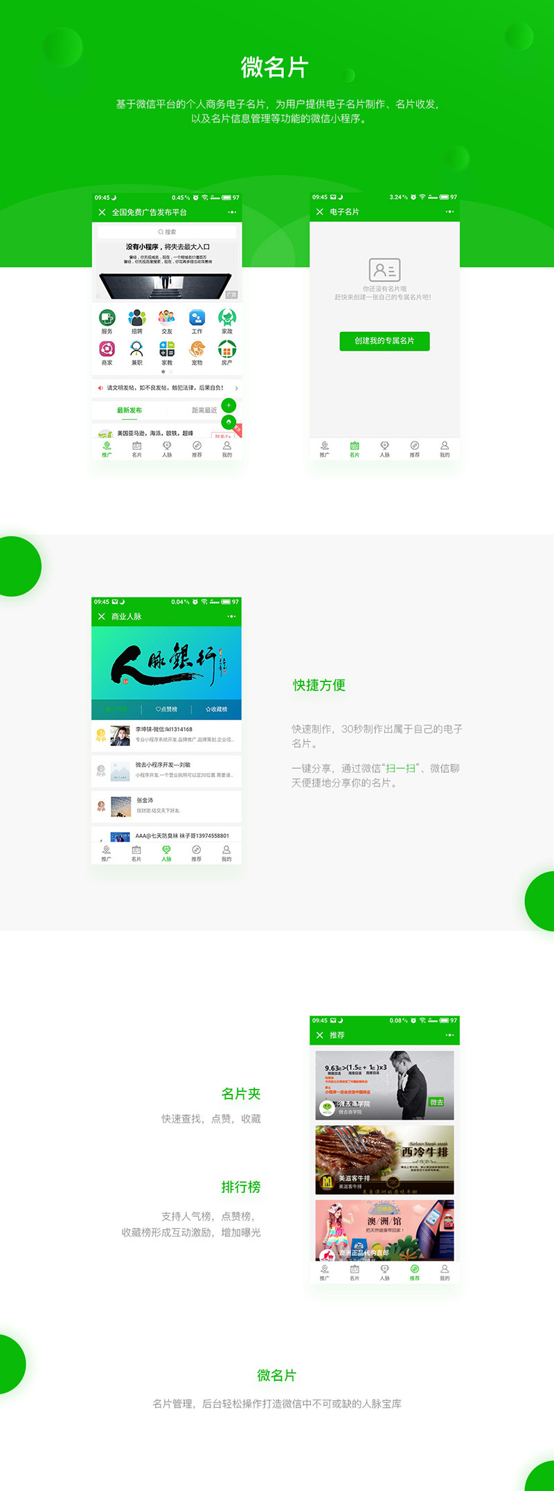系统说明:微名片是基于微信平台的个人商务电子名片,优点在于可在微信聊天窗口里直接分享,并且融入了排名等激励机制,促使用户尽可能多的分享名片,迅速曝光,通过交换个人电子名片可使无限制沉淀自己人脉关系。