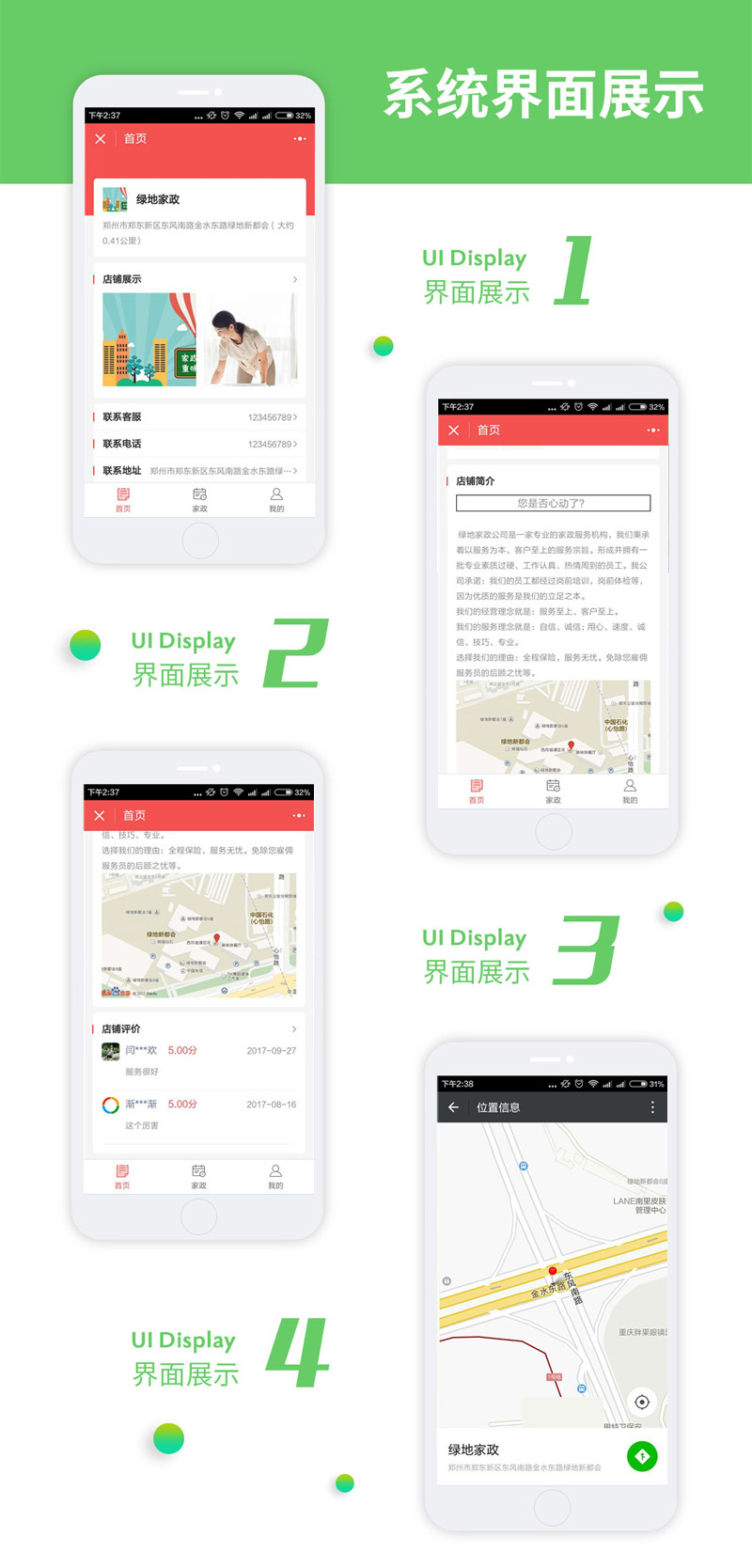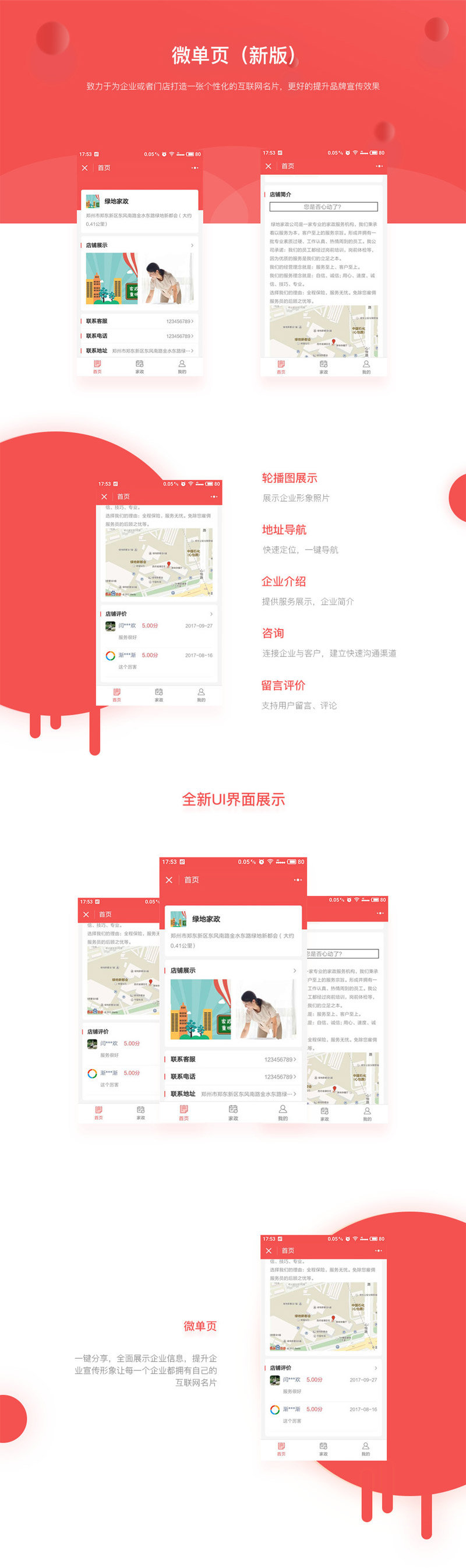 展示内容 :简介、主营、证书、环境、视频、评价、海报、地址、导航、电话、支持多店介绍