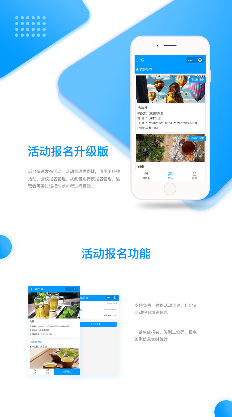 系统说明:升级版支持商家后台发布活动,填写自定义表单项,支持付费报名设置,运营者可通过活动报名模块辅助组织活动和参与者进行互动。