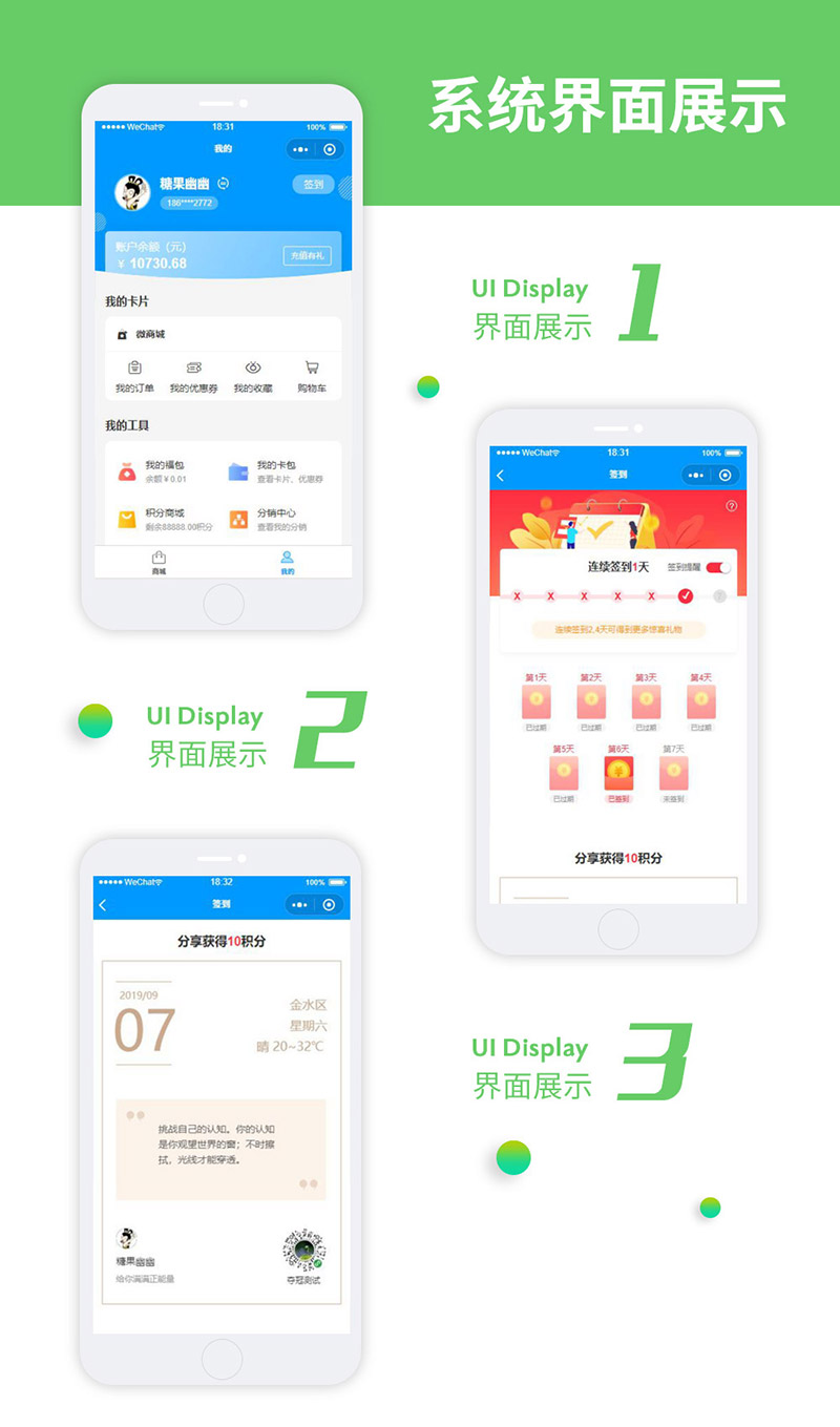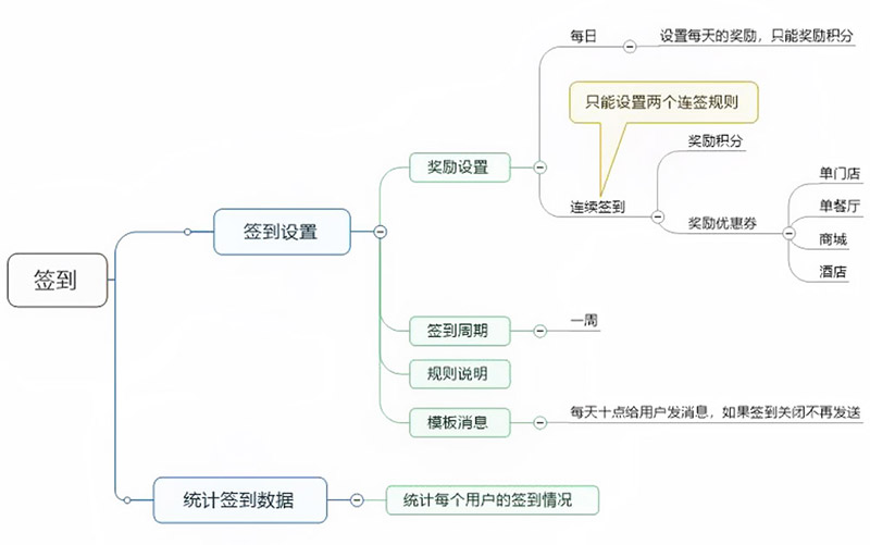 系统说明:签到功能作为一种长期运营手段,能够帮助平台有效提升店铺打开率,提高用户的活跃度。商家开启签到插件,插件周期为7 天(周一到周日),可以设置每天用户获得的积分,也可以设置连续签到的奖励,连续签到用户可以获得优惠券和积分两种奖励;用户可以开启签到提醒,每天10 点给用户发签到提醒模板。签到插件跟海报是组合展示的,如果开启了签到插件,在海报页面上方会展示出来,分享的海报识别二维码之后直接到签到页面,如果签到关闭了,识别海报的二维码显示的小程序首页。
